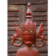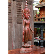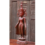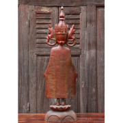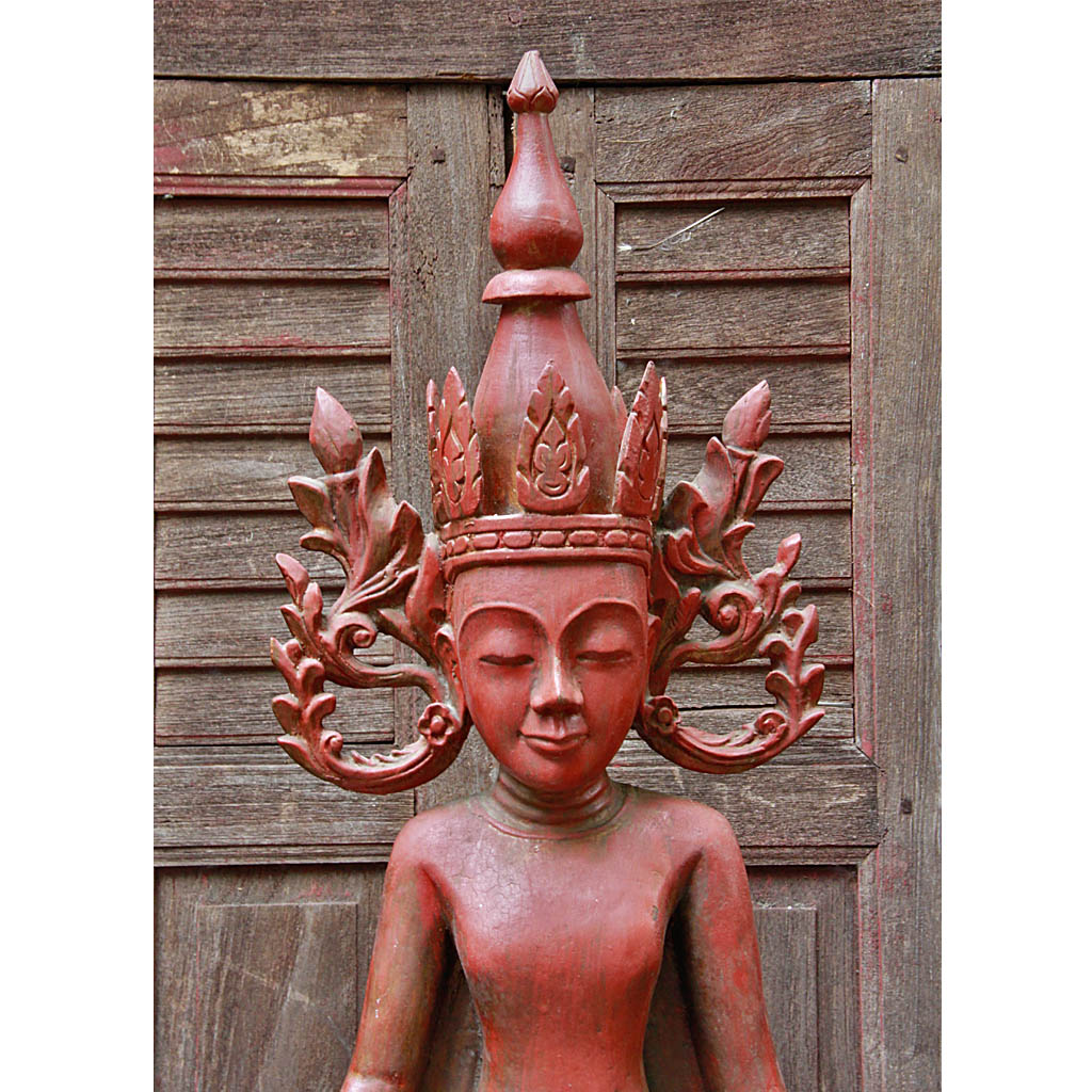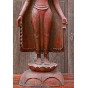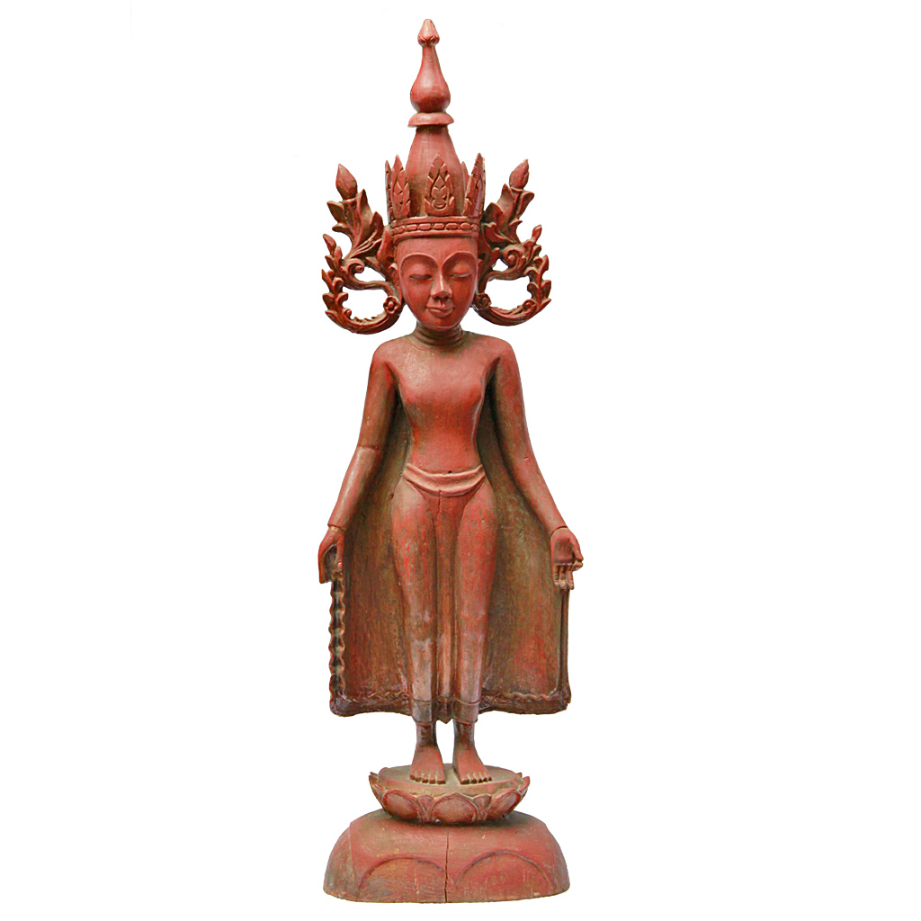 Burmese Teak Buddha Wearing Headdress Standing on Lotus