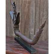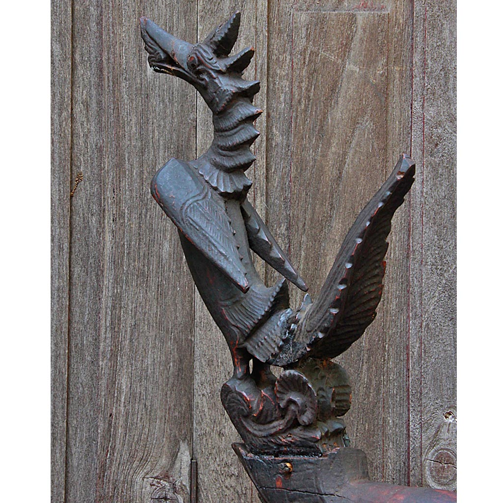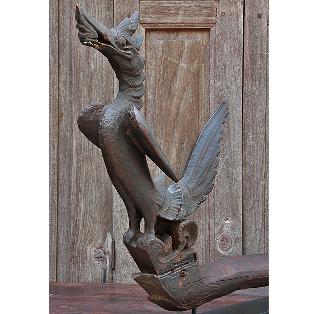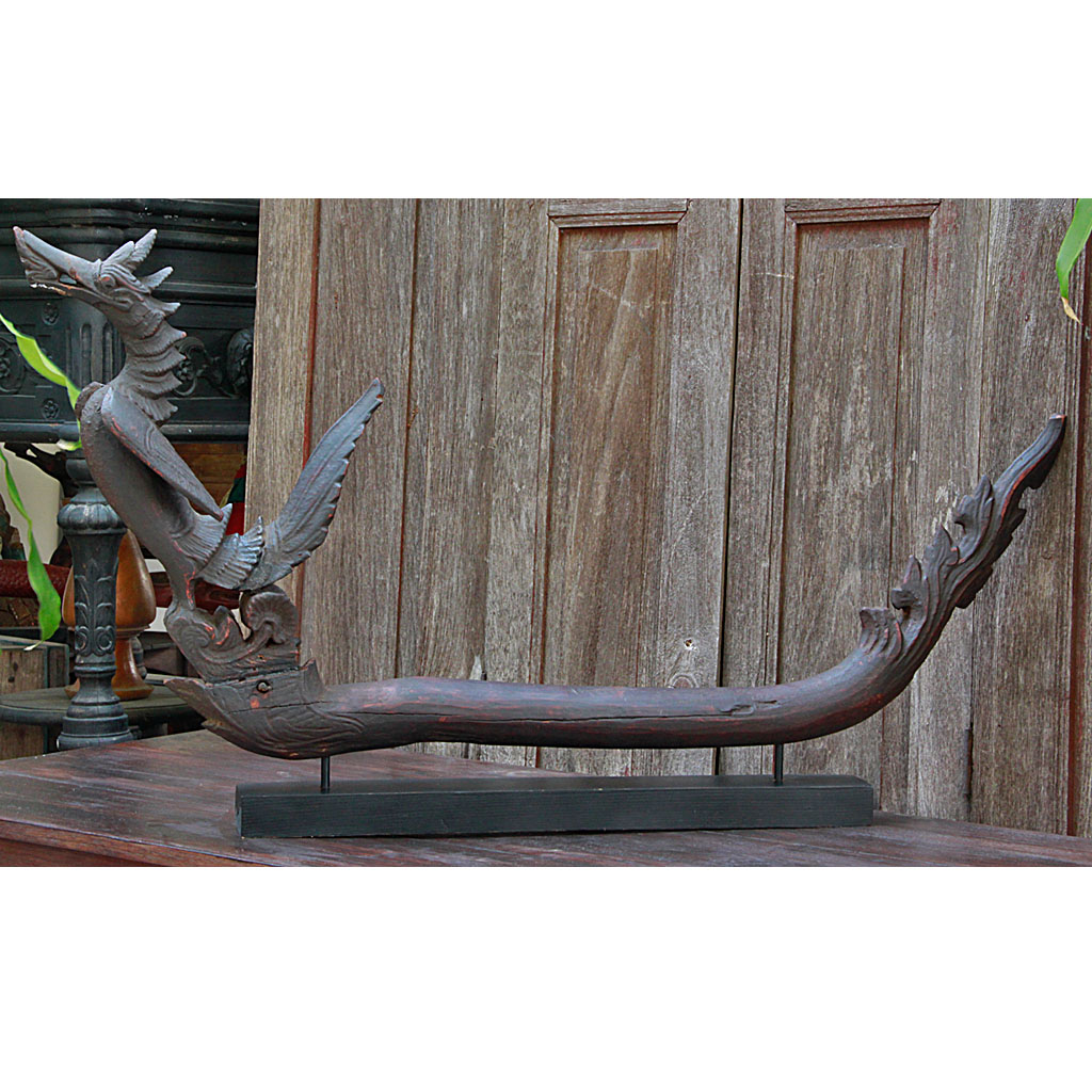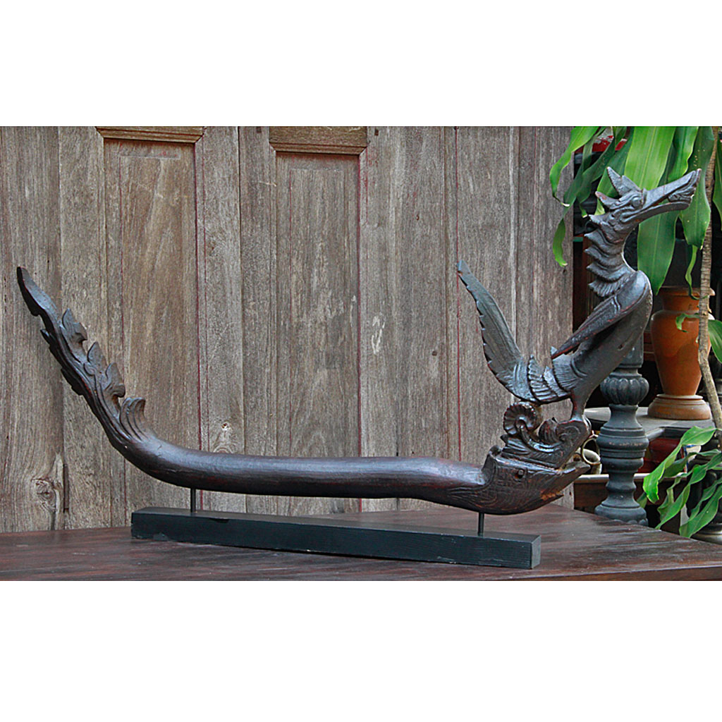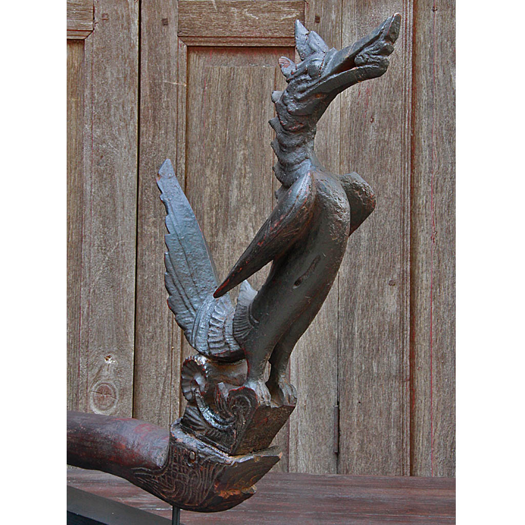 Antique Burmese Teak Ox Cart Prow Carving on Stand of “Hongsa” (Mythical Bird) with Fish in Mouth