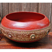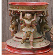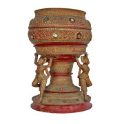 A ceremonial covered tha-beik (monk's bowl) on a stand which has been embellished with moulded lacquer, gilded. The stand features three dancing goddesses.