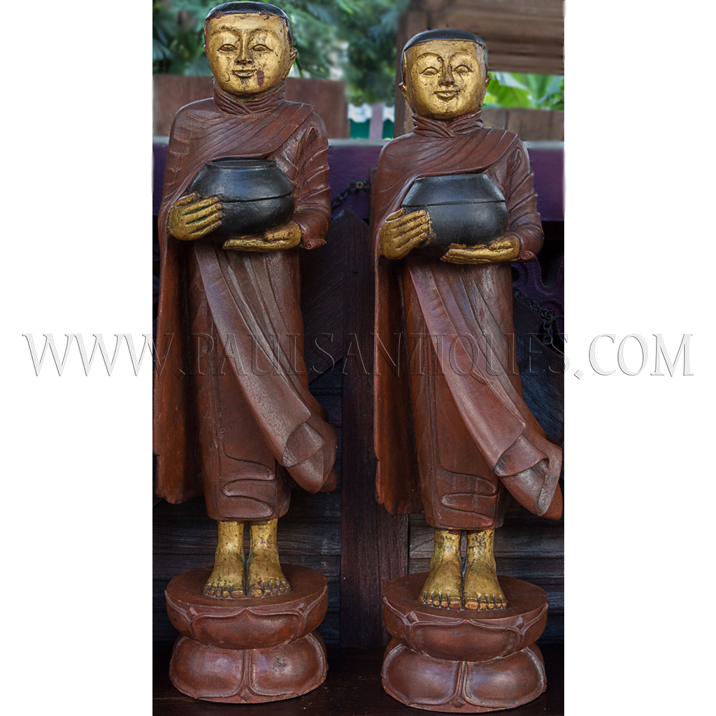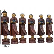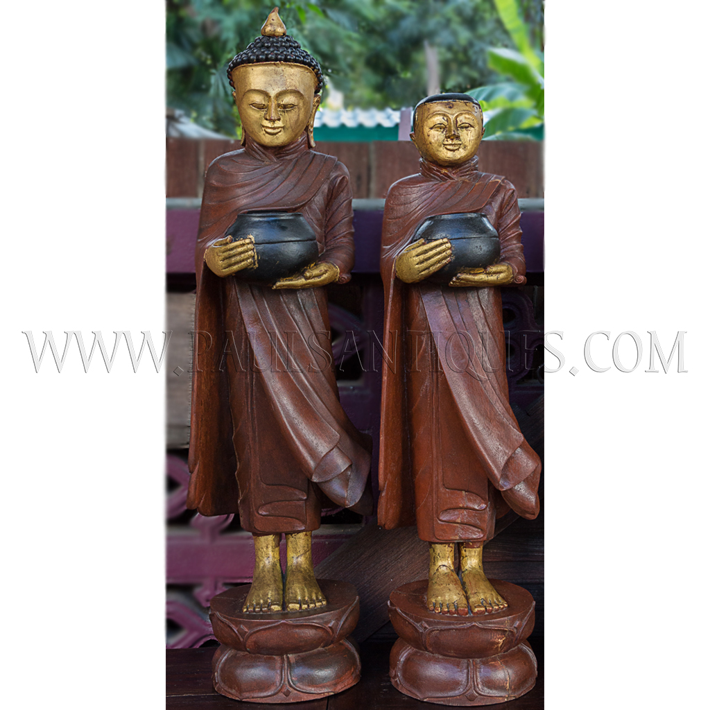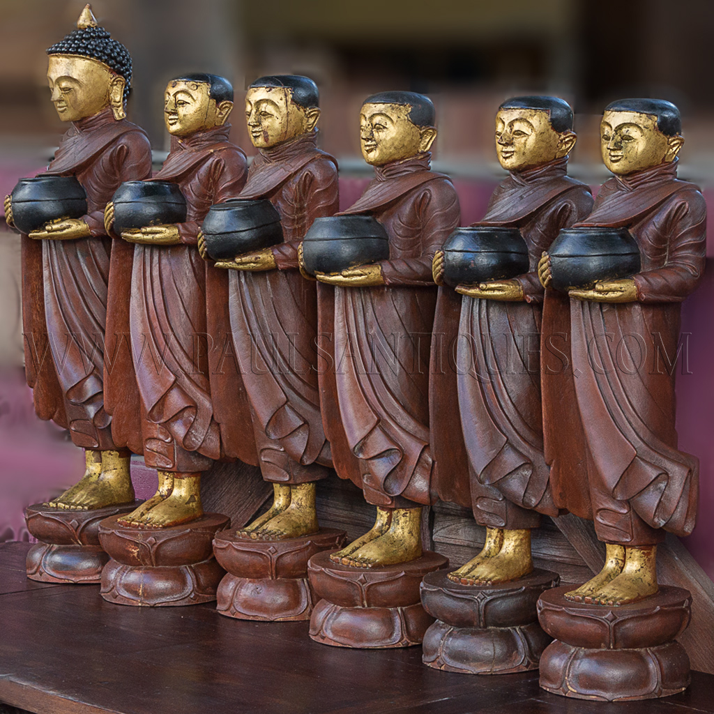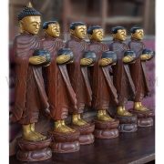 Large Burmese Teak Carvings of Buddha and Disciples on Alms Rounds