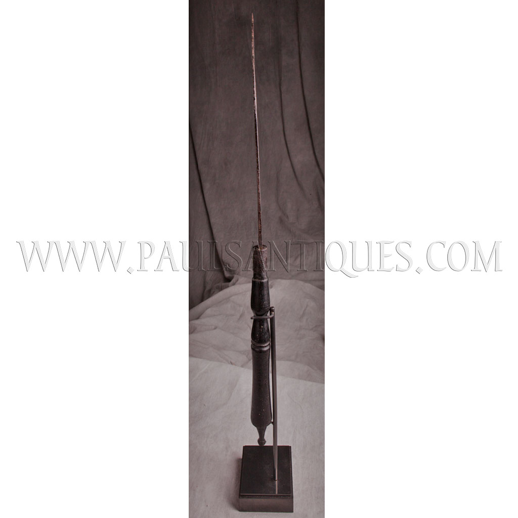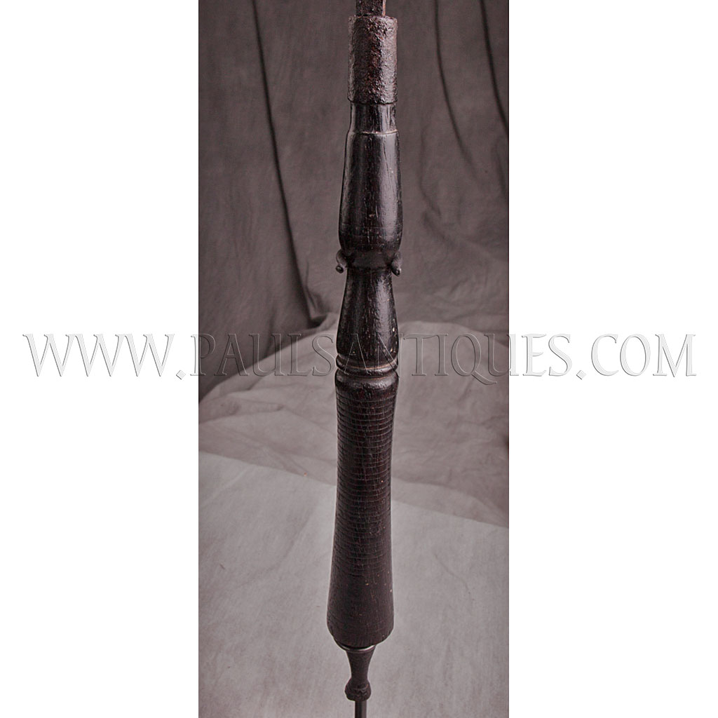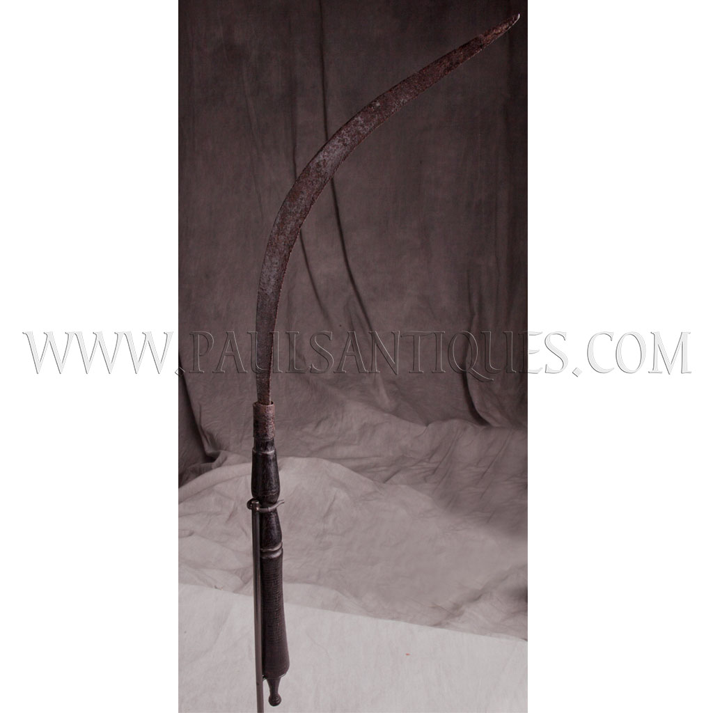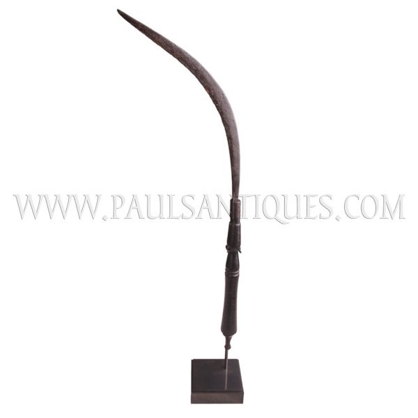 Northern Thai Scythe with Teak Carved Handle Mounted on a Custom Black Polished Brass Stand