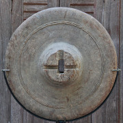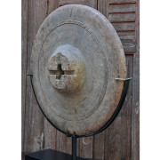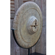 Antique Thai Teak Ox Cart Wheel with Iron Metal Studs on Custom Stand