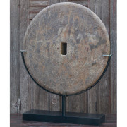 Exceptional antique ox cart wheel made from teak wood with iron embellishments mounted on a custom metal stand.