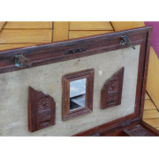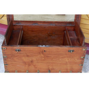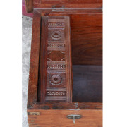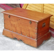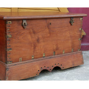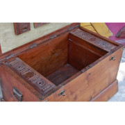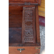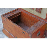 Rare large teak chest from Burma.  The lid and all sides of the chest are made from one piece of thick teak wood.  The inside has the original cloth covering on the underside of the lid with a mirror and carved details.