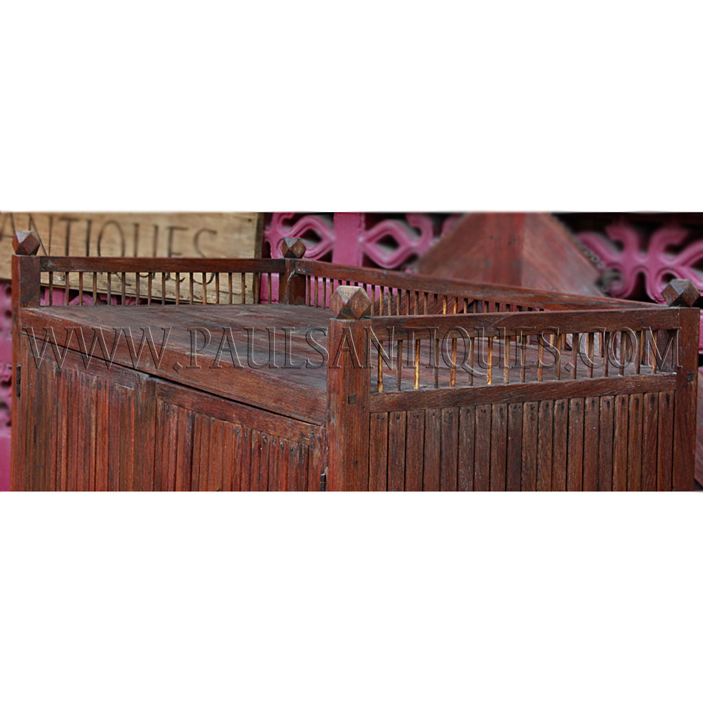 Antique teak wood kitchen cabinet / meat safe from Thailand in a rare slated wood design.  Perhaps one of the most common pieces of furniture throughout Southeast Asian, such kitchen cabinets would be used to store live (such as chickens below) and fresh food items.