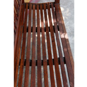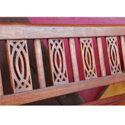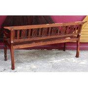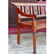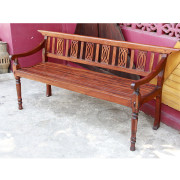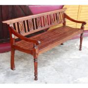 A rare elegant Thai teak garden bench with backrest evoking the gingerbread trim that was a popular design feature of the houses of the well-to-do during Thailand's Rama V era.