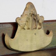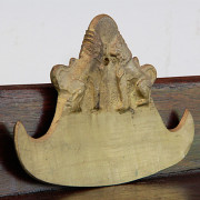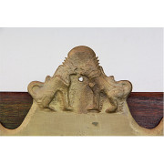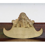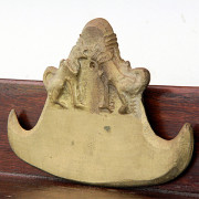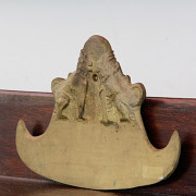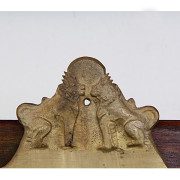 Small golden Burmese spinning gong (kyeezee) with two golden lions engraved in the bronze.  The spinning gong is known for its spinning after hitting it.  The gong keeps its balance as it hangs in a string through its centre hole.